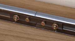 軌きょうの接続継ぎ目板を径3mm,長さ10mmの六角頭のボルトとフランジナットで取り付けました。 写真のジョイント部は約1mmが可動です。 |
