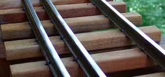 完全に打ち込んだ釘は容易に抜けません。レールに力を加えて無理に抜くとレールの方が曲がるので要注意です。 (4) 組立の際の注意点は,マークの位置が一致していることと枕木とレールが直交していることです。