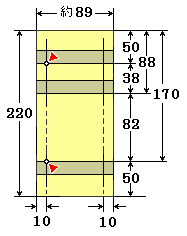 ● 内軌(共用レール)のマーク 位置は曲線半径に関係しますから,レールの長さの割合で比例計算してマークします。 ● 3インチ半ゲージ外軌(中間のレール)は最後に取り付けるのでマークする必要はありません。 |