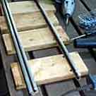 (左写真)1×4材をカットして,ジグを使い,レール取り付け線などを記入しました。 |