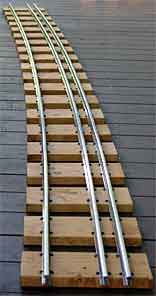 (1) 長さ3mのレールに枕木(板)は20枚取り付けます。全長が15mの区間では100枚必要です。 (右図) レール配置とネジ取り付け位置の図です。枕木上の赤矢印はレールにマークした▼に対応します。 |