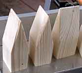 (2) 標柱部の製作 1 木片 を48×36×120mmにカットし,頭部を屋根型にして周囲の角を落としました。(下写真A) 2 下部にマスキングテープを貼り,白ペンキを塗りました。次に,それぞれの位置に文字を切り抜いたテープを貼ります。右端のものは3の文字を切り抜いたテープを貼ったところです。文字フォントはMSゴシック/太字を使っています。(下写真B) 3 黒色ラッカーを吹き付けて丙号距離標の上部が完成です。(下写真C) (A)