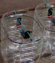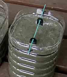 土台のコンクリート型枠はペットボトルを使う簡単な方法です。金具をコンクリートに埋め込む位置も正確に決められます。(右写真) ペットボトルをカットし,コンクリートを入れる高さ(ペットボトル周囲の黒線)と金具の固定位置(水色の針金で金具を保持)をペットボトルに記入しておくと,正確な位置に金具を取り付けることができます。 |
