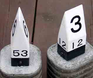 3mmステンレス/トラスネジで標柱を金具に取り付けて完成しました。 文字フォントはMSゴシックをそのまま使いましたが,少し加工した方がより現物の感じがだせるように思います。 コンクリート土台は地中に埋め込み,バラストの中から上部を3cm位出します。 丙号を設置する向きは,数字3または6を記した面がレール と平行な方向に向かい,記されていない面はレールに直交する方向に向きます。 コンクリートの型枠を作らず,ペットボトルで代用したので,土台の四隅に角が無いのと鉢巻きをしている点がやや難点です。 ディスクグラインダー(コンクリート用)などでカットすれば修正は可能です。 |