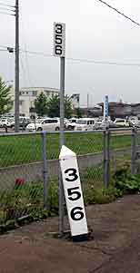 右写真は奥羽本線の東能代駅1番線ホーム上に設置してある距離標で,通常の甲号距離標に針金で支柱を取り付けて高い位置にも表示板があります。