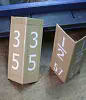 (降雪地の距離標)・・・・ トタン板(大きな板をカット)30円程度,建材のアルミレール(カットして) 320円分,塗料とネジ約50円 合計約400円 ●製作時間 (1個あたり)・・・・2時間 +(文字入れ) 2時間 |