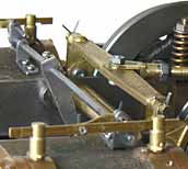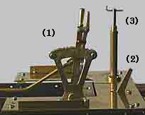 床板に取付ける機器 運転操作に使う機器はすべて床板に取付け,運転室はいつでも取外せるカバーとしての役目だけにしました。蒸気に関係する運転機器は直接ボイラーに取付けますので運転室を取外しての走行 が可能です。 床に取付けるのは ●ブレーキ梃子 ●シリンダーの排水コックを開閉する梃子 ●速度調節と逆転を行なう逆転梃子です。 (写真) (1)逆転器 (2)シリンダードレーンコックレバー (3)ブレーキハンドルです。逆転器は前頁をご覧下さい。 |