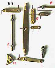 ブレーキの部品は他の車輌にも共通に使われている汎用部品らしく,多種類の鋳物がそれぞれの用途に応じた形状で用意されていました。これらの鋳物を整形加工し,生材から作った部品と合わせてブレーキが出来上がります。 58 ハンドル部の全部品分解した状態なので分かり難いですが,ハンドルaを回すとネジが切ってある部品bが軸上を上下します。 この動きをcが太い軸の回転運動に変えdを押し引きします。 59 主動輪制輪子とリンク部品 58 dの動きはgに伝えられ主動輪の制輪子eに加えられます。一部はfを通して第2動輪に伝えられます。 写真は主動輪の部品ですが,gの穴が等間隔になる以外,第2動輪も全く同じ構造です。下段の組立てた状態の写真もご覧下さい。 |