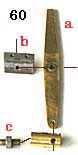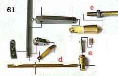 ブレーキまわりでは鋳物部品の加工が主でしたが,こちらの部品はドレーンコックのみが鋳物で,それ以外はすべて適当な端材を加工して作りました。図面に描かれた部品の形では断片的なことしか分からないので,滑らかに動く機構にまとまるかが心配でしたが,作るうちに目的に合った形が分かり,こんな形の方が良さそうだ。・・・と図面とは異なる形にした部品もあります。 部品の数は多くありません。しかし,一つ一つが小さいのでわずかな動きでコックの開閉をスムーズに行うためには遊びを減らし,精度も問題になります。 60運転室の梃子操作部の部品梃子aは1.5mm厚の真鍮板製です。軸受bは厚さ6.3mmの鉄板をサイコロ状に切ってネジ穴を開けただけです。梃子aの動きは径3mmの真鍮棒cによって61に伝えられます。 61 シリンダー底部の排水機構の部品 cによって伝えられた梃子の動きは,dの帯板を左右に滑ら せる動きに変えられます。この帯板dはドレーンコックeの中に挿し込まれてくさび形の箇所で開閉を行ないます。 |