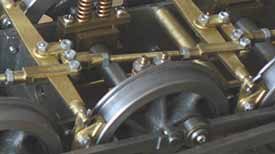 (左写真)シリンダー底面のドレーンコックと主動輪 (右写真)第2動輪のブレーキ機構 |