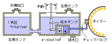 走行中の給水と給油:蒸気となってボイラー内の水は排出されていきますから追加補給します。また,ピストンには潤滑と気密性を保つための給油を常時行います。 |