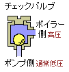 ボイラーへの給水![]() タンク機関車なので,連通管でつないだ左右2つのタンクに水が蓄えられています。 この水をボイラーに送り込むためにはボイラー内の圧力まで水圧を上げなければ水が入りません。 そこで手動の給水ポンプでボイラーの圧力4〜6kgf/cm2まで昇圧して送ります。 タンク内の水は1気圧≒1kgf/cm2≒0.1Mpであり,走行時のボイラー内の圧力は4〜6kgf/cm2なので自動車(乗用車)のタイヤの空気圧の3倍程度になります。 給水ポンプにも逆流を防止する弁がありますが,それ以外にも逆止弁(チェックバルブ)によってボイラー内の高い圧力がポンプ側にかからないように遮断しています。左図のようにチェックバルブの構造は簡単でステンレス球が弁の働きをします。給水する時,ポンプ側が高圧になるのでステンレス球が上に押し上げられて水が通ります。 |