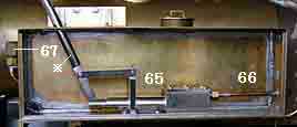 給水ポンプ 給水ポンプは既成品です。写真は内部が見える様にタンク側面の板を外してあります。給水はタンク上面の扉を開いてポンプに棒※を継ぎ足して手動で送水します。タンク後端から出ている給水管はチェックバルブの取付位置をボイラー前端に移した方が良いと考え,途中で設計を変更しました。そのため,タンクの後ろ側を長く迂回して左前に出ています。 65 給水ポンプ 66 給水管 67 逆止弁(チェックバルブ) |