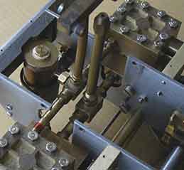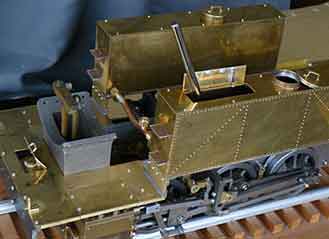 右写真)給油器は給気管の蒸気が左右のエンジンに分岐する位置に金具 69によって取り付けています。 給油器へのオイルの補給は給油器上部のネジ(高圧がかかるのでネジ式の蓋)を外して行います。 給油器はデッキでカバーされるので給油口の真上の床板には開き扉を設けます。 排気管から垂直に立ち上がっているのはブラストノズル(吐出口)で煙突の直下に位置します。燃焼ガスを排出しドラフト(通風)に使います。 |