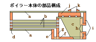 ボイラー本体の製作 製作に使用するのは生材ではなく,旋盤/フライス盤加工が済んでいる12種の部品です。(右図)a 缶胴 b 煙管/径は2種 c 内火室板 (以上,銅製) d 煙室管板 eスロートプレート fファンデーションリング g 内火室管板 h 内火室後板 i 外火室後板 j クラウンステー k 蒸気溜取付座 (以上,砲金鋳物製) これらの部品を組み合わせネジやリベットを併用し,手順に従って銀ロウ付けをくり返しボイラーを完成させます。 ![]() ![]() ![]() 72 ボイラー本体 缶胴と外火室は径101mm,厚さ2mmの銅パイプを使用しています 。パイプは缶胴の接ぎ合わせがないので銀ロウ付けが少し楽になります。内火室と外火室との間には24本の補強ステーが入っています。 |