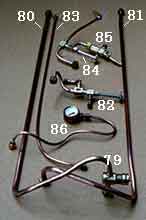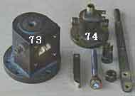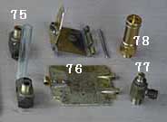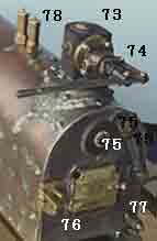 *2真鍮鋳物と砲金鋳物を銀ロウ付けした頑丈な造りで,蒸気分配箱(マニホルド)も兼ねています。蒸気溜から5方向に蒸気配管を伸ばします。 ●加減弁 (レギュレータバルブ)*1 運転室側面から指先だけを入れて操作できるレバー式の加減弁です。閉から全開まで,加減弁ハンドルの操作角度は約15度です。 73蒸気だめ(溜) 74加減弁 (部品数/6点) |