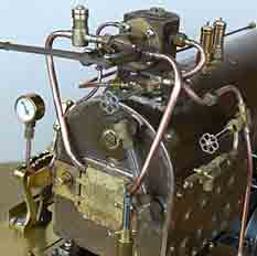 蒸気配管と配管に接続する機器 ●スニフティング弁 ![]() 設計には無かった弁ですが加減弁の横に取付けてみました。材料は真鍮棒と真鍮パイプ,ステンレス球,組み立ては銀ロウ付けです。これでシリンダー内の圧力は最低でも1気圧に保たれます。 全速走行中に加減弁を閉じるとピストンの運動は真空ポンプのように作用し給気管内は減圧します。この状態は煙室内の煤煙などがすべり弁のところから低圧になっているシリンダー内に侵入するおそれがあります。 また,ピストンは給気系統の気体を断熱膨張させるので管内の温度を下げ,給油(器)系統への影響も考えられます。弁はそれらへの対策です。 79スニフティング弁 80過熱管/左 81過熱管/右 82通風器弁 83蒸気配管/通風器 84汽笛弁(1)/ニードルバルブ 85汽笛弁(2)/レバー式 86圧力計と蒸気配管 ●過熱管長さ55cm,径5mmの銅パイプを曲げ加工します。過熱管は左右2本に分けて火室内を通し,煙室内で再び1本にまとめます。 過熱管は高温の乾いた蒸気をエンジンに送る方法で,燃焼中の火室にパイプ(過熱管)を通すことで水蒸気を再加熱します。この過熱管は更に給気管70,蒸気室(スチームチェスト)26へと接続 されていきます。 ●通風器弁 通風器に蒸気を送る際に開く弁で,ニードルバルブ(既成品)です。 停車中などに弁を開き余剰の生蒸気を煙突から噴出します。これによって煙室内が減圧し,内火室の燃焼ガスが煙室方向に吸引され火床に新しい空気が供給されます。(この通風については煙室と煙突をご覧ください。) ●汽笛弁*3 一瞬の間だけ弁を開閉したり,音量を変えられる(=通過蒸気量を変える )ことが必要になります。そのため,ニードルバルブとバネ付きのレバー式の弁(いずれも既成品)を使います。(汽笛については汽笛104をご覧ください。) ●圧力計 運転中,後方の高い位置からも見易いように取付位置を低目にしました。圧力計の手前の配管が下に大きく曲がっているのは,ここに凝結した水を溜める目的です。 このライブ用圧力計の直径は3/4インチ≒19mmと小さく実用性よりはアクセサリーとして取り付けました。英国製なので表示目盛りは〔ポンド/インチ2〕の単位です。 |