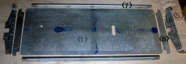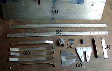 車台を構成する部品 部品は次の9種類28個のみでこれらをネジ留めして組み立てます。(写真→)-------------- 1 床板 2 フレーム 3 フレーム取付用アングル 4 前端内梁 5 前端梁 6 前端梁上板 7 側梁 8 軸箱守 9 横梁 (説明↓)-------------- 1 床板 厚さ3mm,61×23cmの鉄板でこれ自体がかなりの重量です。 機能は床板では無く,板状の車台(シャーシ)という感じです。バッテリーを載せ,モーターや2軸の車輪を取り付けるには最適な形です。 2 フレーム 床板が頑丈なのでフレームは軸箱守などの足まわりの部品を床板に取り付ける金具の役割
