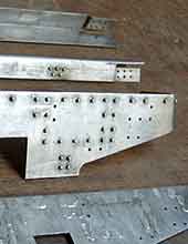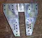 ます。1枚の板でこの形を切り出すとすると,3mm厚の鉄板なのでかなりの労力がいる筈です。(右写真) 9 横梁 左右のフレームに跨って繋ぐ鉄板で,床下に肋骨のように取り付けます。 |