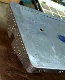 5 前端梁 この機関車の特徴は多数のリベットがあることで,前端梁だけで118本のリベットが付いています。小さなリベットの入手が困難で,東急ハンズで見かけた2mmの真鍮球で試してみました。その方法は鉄板に1.8mmの穴をあけて皿モミし,真鍮球をこの穴に置いて裏から半田付けするという面倒なやり方です。 頭の丸い銅や真鍮釘をカットしてリベットのようにし,接着剤でとめるのが簡単とも思いましたが,接着剤の使用には抵抗があるのと,釘のカットにも時間がかかるので,真鍮球で試 してみたわけです。 この半田付けには約8時間かかりました。時間的にはリベット打ちや接着剤による方法と大差ないような気がします。キットのアルミリベット/頭の径2.8mm/は使いませんでした。 (上写真)リベットを「打った」表側と裏面とを並べてみました。裏面は半田の跡はありますが滑らかです。リベットを実際に打つと突起が出るので,真鍮球を使う方法にも多少長所があります。 6 前端梁上板 前端梁と側梁の高さをそろえるための板ですが,車体を載せたとき,外から見えるのはこの部分と側板だけになります。ネジが目立たないようにネジ留め箇所は皿モミし,皿ネジで取り付けます。 7 側梁 床板の縁に取り付ける1mm厚の鉄板で,アングルから作ります。左右合わせて50本のリベット(真鍮球)を付けます。5個並べて,同時に半田付け出来るので,50個付けるのに約30分という効率の良さでした。 8 軸箱守 厚さ3mmの5角形の鉄板2枚と長方形のスペーサーを半田付けして1個の軸箱守を作ります。大型の半田鏝で付けると以外に簡単でした。強度も十分あり