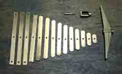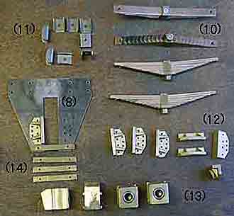 させるデザインで,模型というよりは実際の車輌のような頑丈さを備えているような気になります。(写真→)-------------- 8 軸箱守 10 担板ばね 11 担板ばね受け 12 軸箱受け金具 13 軸箱 14 軸箱守控 (説明↓)-------------- 10 担板バネ 固定2軸車の典型的な板バネの構造です。 ダミーではなく,長さを整えた14枚の隣青銅のバネを重ねて中央を枠とネジで留め,実際に機能するように作ります。 形だけの模型でなく機能するように細部を作るのは模型製作を一層楽しくします。 (写真下)青銅板を切りそろえた担い板ばね です。 を 11