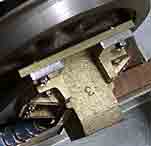 担板バネ受け板バネは可動状態で保持するので両端を支える3mmネジは強く締めません。そのネジを隠します。 (写真左)担板ばねと半田付けして作った枠 とネジです。右側はバネを枠に入れネジ止めした完成状態です。 12 軸箱受け金具 真鍮鋳物で1個あたり7つの取り付けネジ穴をあけます。左右のスライド面の間で軸箱がすべるので両面が平行になるように取り付けます。 ただ,径2mmの穴に対して1.7mmのネジ留めなので取り付け時に多少は修正が可能です。 13 軸箱 真鍮鋳放しの部品の外側をヤスリなどで整えて軸箱受け金具(上記12)とのスライド面を仕上げます。 次に,給油口を開け車軸を受けるニードルベアリングを嵌め込みます。 軸箱のスライドする方向と車軸の方向は基本的には直角ですが,カーブなどで車体がα傾くと車軸は直角の位置からα傾くことになりますから,支障なく上下動する形状(平面に近い円弧)にします。 14 軸箱守控軸箱が下に抜け落ちない様に止める板で,2.2mmの穴に2mmのネジで止めます。 (写真右) 下から見た,軸箱と軸箱受け金具,軸箱守控です。 15 車輪と車軸 動輪なので車輪