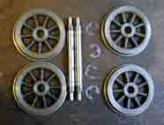 当たりをとった位置をヤスリで削って,再び車輪を嵌め押しネジで車輪を車軸にしっかり固定します。(左写真)車輪と車軸,Eリング (右写真)各部品 10〜15 が組み立てられた状態です。軸箱上部の穴は車軸のニードルベアリング部に給油する穴です。 |