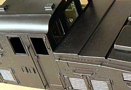 エアブラシは入り組んだ微細な箇所でも塗り残し無く薄い塗膜で綺麗に塗装できます。この様な所をスプレー缶で塗装すると様々な方向から塗料を吹きつけなければならず,塗膜が厚くなって細い溝などは埋まってしまいます。 一方,エアブラシは塗料の噴出量が少ないので車体の広い面の塗装ではスプレー缶の様に手早く作業を進めることができません。 (左上写真) 前照灯と取付け金具の細部まで塗料がまわりました。半田付けの跡が分かるほどの薄い塗膜ですがミッチャクロンの効果があるようで付着状態は良好です。 |