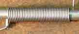 連結器に取り付けたバネは「生きた蒸気機関車を作ろう」(下記注1)の記述を参考に自作した引張コイルバネです。径0.9mmのピアノ線を径5.8mmの鉄丸棒に43回巻くと出来上がりの外径8.4mm,38巻になりました。バネ定数は0.45N/mm (=44g重/mm)程度です。 |