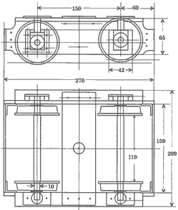 台車枠 ホームセンターで安く購入できる鉄材のみで作ります。したがって,限られたサイズの材料を組み合わせることになり,形や構造に制約があります。 頑丈にするために台車枠は長方形の枠組で,カーブ通過を楽にするために車軸間の距離を150mmと狭 くしています。もっと狭くすることも考えましたが,ブレーキ取り付けのスペースも必要で,この値にしました。 この形は軽便鉄道の2軸機関車の台車枠に似ているような気がします。