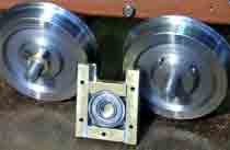 この構造はカーブを踏面勾配に依存して回る方法ではないので,カーブを直線レールに近い抵抗力(ほとんどが転がり摩擦)で通過するはずです。 車軸の製作 長さ200mm,径12mmの鉄ミガキ丸棒を4本用意し,両端を車輪とベアリングの穴に合わせて径10mmに削ります。この車軸は上写真のボールベアリング自体を軸箱代わりにして支えます。 写真 真鍮で作ったシャフトカラーをはめた車輪(左側)と押しネジで車軸に固定した車輪(右側)です。 中央はベアリングの入った軸箱です。(軸箱守も兼ねています。) |