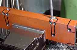 台車枠の製作 主な材料は鉄のアングル2種とフラットバー2種,角パイプ1種です。 ●アングル(6×65×65mm)材をカットしました。厚さ6mmの鉄材はかなり手強い相手です。 ●10mmのキリで要所 々々に穴をあけ,コイルバネを入れるスペースを作っています。写真 ●台車枠はすべてネジ留めにし,組立て分解を可能にします。ネジを切る箇所は全体でかなりの数になります。 |