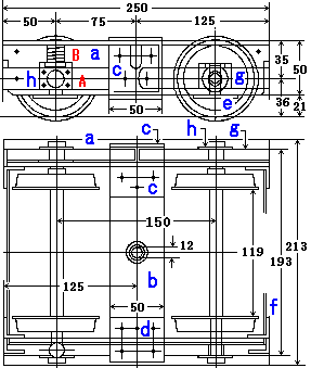 製作する上で最も工夫を要するのがベアリングを入れる軸箱(図のA)とレールに順応する車輪の緩衝機構(図のB)です。 |