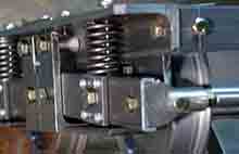 (左写真)前方から見た連結器です。いろいろなタイプの連結器に差し替えられるように箱型,2段構造になっています。写真は「中間引き棒」を取り付けた状態です。 |