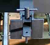 (左写真)枕梁の上には直径30mmの平戸車のついたフレームが載りますから,センターピンは長く上に突き出しています。径16mmの建築金物を加工してあり,頭の12mm六角ボルトで枕梁から抜けないように留めます。