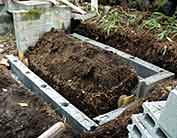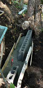 を狭く深い溝の底に積むのは困難です。「捨てコン」の中に直接7〜10cm埋め込んで並べてしまいました。
