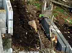 地面を幅40cm,深さ50cmまで掘り下げました。枠板などを省略し,「捨てコン」を厚さ15cm位まで流し込むだけで基礎を作るので溝は正確に掘りました。