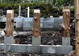 鉄筋の無いブロック積みは一体としての強度が無く,鉄筋を入れたいところです。しかし,段差のある基礎コンクリート工事の最中に縦筋の正確な位置決めをするのは大変です。