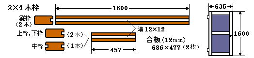 ドアは枠木が「日」の字型になる単純なもので,2×4材の枠木5本に12mmの溝を掘り込んで,12mmの合板を嵌めてコーススレッドで組み立てます。
