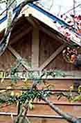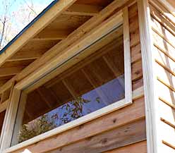 杉板の末端や節の所は下穴を開けないと板が割れます。合板等とは異なり無垢の杉板は仕上がりがずっと綺麗に見えます。木目や節のバランスにも注意しながら,その場所に適した板を選んで加工し取り付けていきます。 |