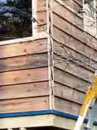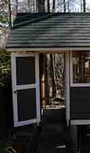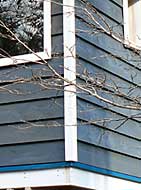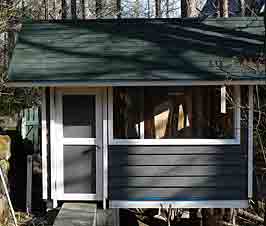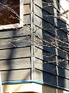 | 2色に色分けするので白色に塗る縦桟や窓の枠木など,取り外せる部材を一旦,外しました。 | 要所々々にマスキングテープを貼り,シルバーグレイ色を1回塗りました。まだ板の地色が見えています。 | 2回塗り後,マスキングテープを剥がし,白く塗った縦桟と窓の枠木を取り付けて塗裝完了です。 |