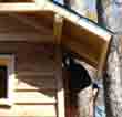 (2) 屋根の切り欠き部を塞ぐ 駅舎を建てた場所には唐松があり,落葉期に伐ってもらう予定で軒先を幹が突き抜けた状態で駅舎を完成させました。 雪解け直後に伐採し,唐松を囲む形で切り抜いてあった屋根を通常の形に造り直しました。