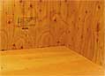 屋根パネルに使用した合板(=野地板に相当)は木目が綺麗だったので,室内から見たときはそのまま天井板にみえる様に造りました。(1枚の板をこの様にするには長いシングル釘で屋根を葺くと天井側に突き抜けるので短いトラスネジを使用するなどの対策が必要です。参照;屋根葺き