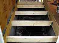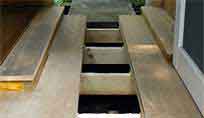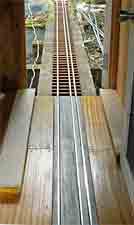 (上写真)将来の床下利用に支障がない様に,ホーム,床板,「併用軌道」は個別に根太へ取り付けます。併用軌道部分と床板部分とは2×4材の上にラワン板を張った同じ構造です。 ● 併用軌道部分の製作については軌きょうのページに纏めました。 |