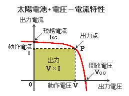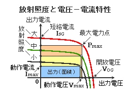 (1) 太陽電池の特性 「太陽光発電所」では太陽電池モジュールから得られる電力を電池のように独立した電源として利用します。そのためには太陽電池で発生する電圧や電流の特徴,太陽電池の 特性などを調べてみる必要があります。 12V,125W独立型システムの太陽電池モジュールということから,最大出力時の電流,電圧についてはある程度分かります。しかし,実際に使用するときには日射(放射照度)による電圧・電流の変動や消費する器具 に直結すると太陽電池で発生する電圧・電流が変わってきます。太陽電池モジュールの出力をできるだけ効率よくとり出すにはどのようにすればよいかも考えてみました。 A 電圧と電流 ● 太陽電池(pn接合型ダイオード)に可変抵抗Rを接続し,一定の放射照度の光を照射して,太陽電池に発生する電圧と抵抗を流れる電流を調べると右図の形の電流−電圧特性曲線が得られます。 抵抗値をR=∞にしたときの電圧を開放電圧Voc,抵抗R=0のときの電流が短絡電流Iscになります。 購入したモジュールで実際に晴天の日の正午頃,開放電圧を調べてみると20V程度になりました。開放電圧と短絡電流は日射量(放射照度)や気温によって変わるのでモジュールのVocの公称値は気温25℃,放射照度を1000W/m2にしたときの値のようです。 太陽電池の出力(=抵抗で消費される電力:W)は電流−電圧特性曲線から求めることができ,図の面積(W=V×I)になります。この面積が最大になる出力点を動作点Pにすれば,出力が最大になる動作電圧Vmax と動作電流 Imax が分かります。 実際の電気器具には適正な使用電圧があるので出力最大の動作電圧Vmax で機器が使用できるとは限りません。 もし,単純に最大出力をとり出すだけならば R=Vmax÷Imax の外部抵抗を太陽電池に接続すれば発熱の形になりますが簡単に取り出せます。 もちろん,Rの値は放射照度の変化によって変りますから,Rを固定抵抗にしたのでは常に最大出力は得られません。 ● 乾電池などの端子電圧は大電流でなければ内部抵抗の影響が小さく,起電力に近い値でほぼ一定しています。 一方,太陽電池の場合は負荷や放射照度(日射)によって動作点Pが動くため,端子電圧の変動が大きくなります。 太陽電池を安定した電源にするには端子電圧を一定に保つための回路が必要になり,そのときの電圧は最大出力が得られる動作電圧Vmax にすればよいことになります。 ● 「太陽光発電所」の着工以前は太陽電池の特性にまで遡って考えたことがなく,「12V太陽電池モジュール」 ≒「12Vの電池」のような感じをもっていました。しかし,モジュールに発生する電圧は負荷次第で0〜開放電圧Vocの幅があります。 12Vの電池と12V太陽電池モジュールとの違いは,大きな抵抗値の負荷を直接接続し微弱電流を流すとき電池では負荷に12V(=起電力)の電圧がかかり,太陽電池モジュールでは日照時には20V近くの電圧がかります。 12Vモジュールでは電流−電圧特性曲線が急激に曲がる箇所が12V付近にあるので,動作電圧がVmax ≒12〔V〕となり,この付近の電圧でモジュールから大きな出力が得られます。 動作電圧を12〔V〕付近にすると効率が最大になるので12Vモジュールというのではないかと思います。モジュールのVmaxを12〔V〕にしておくメリットはバッテリー等,自動車関連機器の多くが12〔V〕なので利用しやすい電圧だと思います。