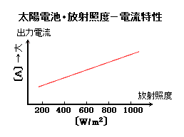 B 放射照度と電流 ● 太陽電池の出力は放射照度(日射)に比例するので放射照度が変われば動作電圧Vmax や動作電流 Imax の値も変化するはずです。 放射照度が変わった場合,Vmax≒V=12〔V〕に固定したのでは損失が大きくならないのか,気になったこの点について調べてみました。 (1) この問題を解決したのは,購入した太陽電池のモジュールに付いていた,「規定電圧による放射照度―出力電流」の関係を示したグラフです。(右図) グラフは直線とみなせるので,出力が「規定電圧」(=12〔V〕?)のとき, (放射照度)=A×(出力電流) であることが分かります。 (2) このグラフによらず,一般的に考えてみました。光電池の出力は放射照度に比例するので (放射照度)=B×(光電池の出力)=B×(出力電圧×出力電流) となります。出力電圧が一定ならば,A=B×(出力電圧)として (放射照度)=A×(出力電流) となり,上の(1)と同じ関係が得られます。 出力の電圧を<一定値>=12〔V〕≒Vmaxに固定した場合,日射(放射照度)の大小は電流の強弱となって出力に関係することが分かりました。