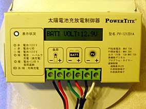 (2) PWM型/チャージコントローラー 12V独立系太陽電池モジュールの出力が最大になる動作電圧Vmaxは12V付近(上記)なので,これを利用して出力をとりだすチャージコントローラーです。 電圧12V(12V前後の値)の出力はPWM(パルス幅変調)型のDC/DCコンバーター回路で取りだします。 ▼この方式は低価格の割に効率がよいらしいので,建設費を節約したい「太陽光発電所」に向いています。 ▼玩具に使用する程度ならばチャージコントローラーを省略することもできますが,実用的にはバッテリーの充電と電圧・電流を制御するチャージコントローラーが無いと電力をうまく利用できません。 ● チャージコントローラーは太陽電池モジュールで発生した電力を電圧12Vで負荷に供給し,余剰の電力があればバッテリーに充電します。また,夜間等にはバッテリーから負荷への放電を制御します。 (右写真)高原鉄道のチャージコントローラーです。バッテリー で発生するガスの影響を避けるために室内に設置し,発電状況も確認しやすくしました。コントローラー裏面の放熱板はアルミのフライパンの底を丸く切り抜いて廃物利用しています。 ● チャージコントローラーの機能はメーカーや機種によって異なりますが,一例として「太陽光発電所」で使用しているチャージコントローラーのはたらきを模式図にしてみました。(左図) ≪主なはたらきの説明≫ A モジュールの出力を12Vの定電圧で負荷に供給 B 余剰電力を最適な電圧16.5V〜12Vに制御しながらバッテリーに充電,満充電終止電圧は14V C モジュールの電圧低下時,バッテリーからモジュールへの逆流電流を遮断 D 日照が無い時はバッテリーから負荷に電力を供給,過放電を防ぎ低電圧切断電圧11.2V